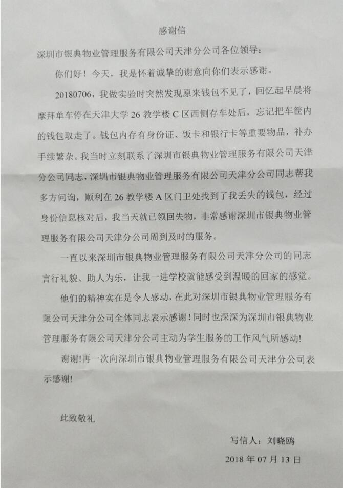 2018年7月6日早上,一名天津大學自動化學院的學生因著急回實驗室做實驗,在第26教學樓C區西側停車處停放共享單車時,一時疏忽,忘記將車筐內錢包取走,錢包內有身份證、學生一卡通、銀行卡等重要證件,此類證件一旦遺失,補辦手續相當繁雜。故當該名學生想起錢包未取返回停車處時,發現錢包已不見,內心非常焦急,經多方問詢,得知錢包已被我司外圍巡邏崗工作人員放于第26教學樓A區一層值班室,以便失主認領時,焦急的心情總算平復一些。
